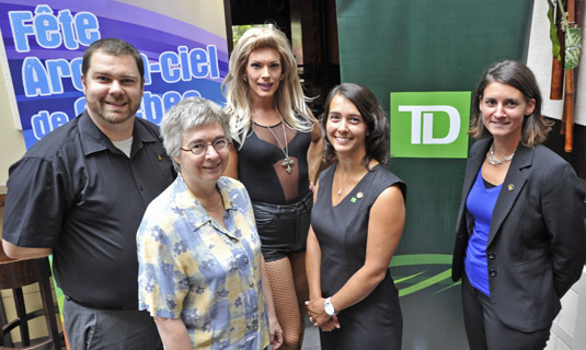 La banque TD est le principale commanditaire. Thème: «Femmes, on vous aime». Olivier Poulin, coordonnateur, Colette Bazinet, animatrice du colloque, Gyzel, personnificateur de Madonna, Julie Blackburn, directrice de succursale TD, Karine Verrette, vice-présidente de GLBT Québec.